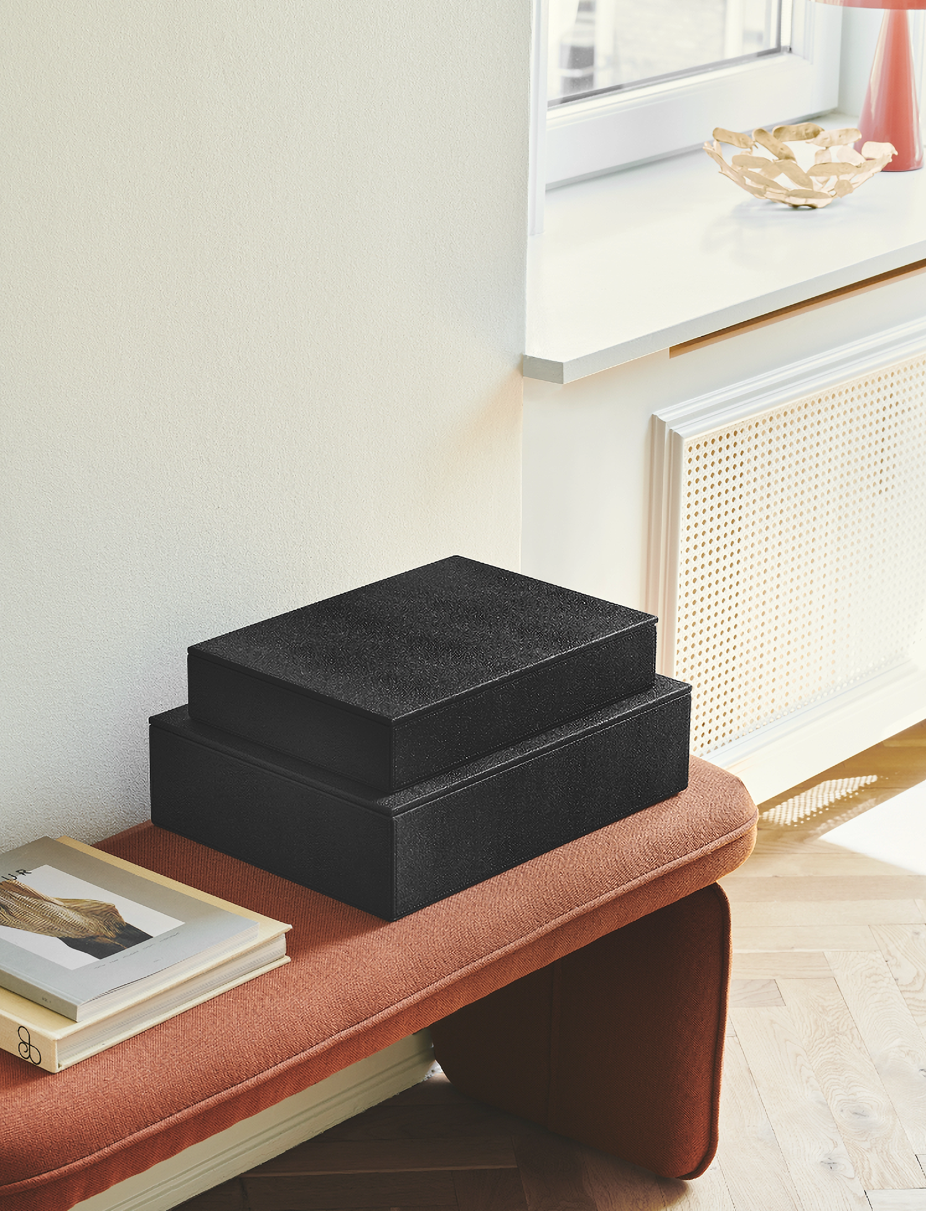 STING storage boxes come in a set of 2 boxes, 40x30x10,5 and 25x35x7, which are perfect for those who want a large, practical and elegant storage facility. Use for example the largest box in your hallway for gloves, hats, bikelights and the smaller box at your office for documents. Only your needs set the limit. Designed by Mojoo.