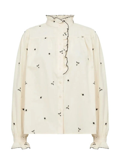 Verleiht mit dem gerüschten Stehkragen einen Hauch von Eleganz.