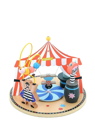 1,5+ JahreCircus activity toy with festive colours and fun features.The round arena with a striped, yellow circus tent contains several different activities such as canon king, acrobat, rotating wheel, thread maze, circus horse and rabbit in a hat.Illustrated by Michelle Carlslund.