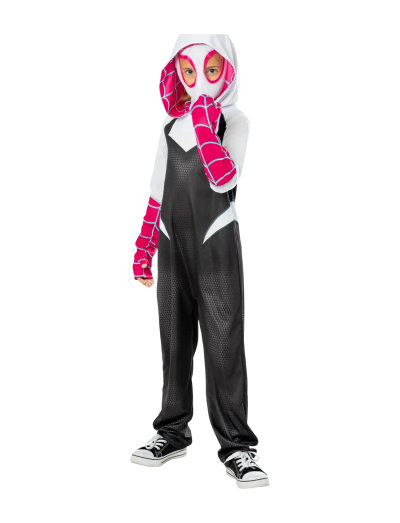 Spider-Gwen Classic costume with mask. Dress up in jumpsuit with hood and snood and enter the world of Spider-Gwen and protect the web of life! Officially licensed costume from Rubies