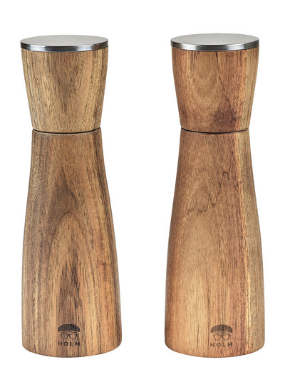 Stylish salt and pepper grinder set in acacia wood with ceramic grinder insert. The steel top and aesthetic shape give the grinders a super elegant look. Treat the grinders with cooking oil a few times a year to maintain the warm glow of the wood. Height: 20.5 cm.The product is made from FSC™-certified acacia wood (FSC-C166612).