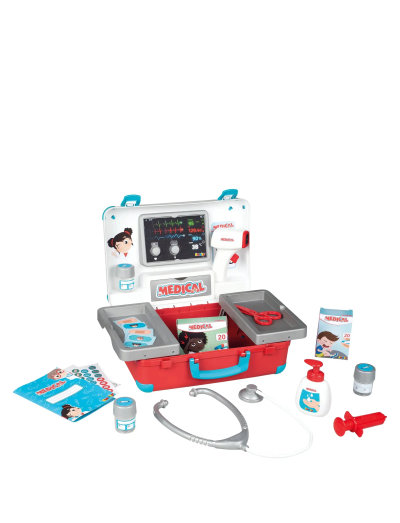 This medical case has many accessories: 1 syringe, 1 mechanical thermometer (green, orange, red), 1 stethoscope, scissors, 1 foaming soap hand, 3 specimen bottles, 1 healthrecord booklet to personalize, 2 dummy boxes, and self-sticking plasters.