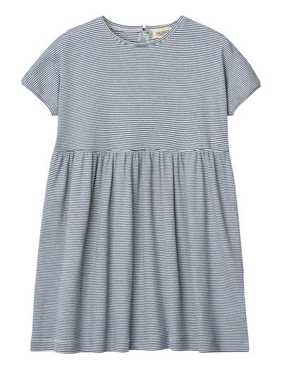 Þessi kjóll er fullkominn í daglegt notkun. Hann er úr mjúku og þægilegu efni og hefur klassískt stripað hönnun. Kjólarnir eru lausir og með stuttar ermar, sem gerir hann fullkominn fyrir hlýrra veður.