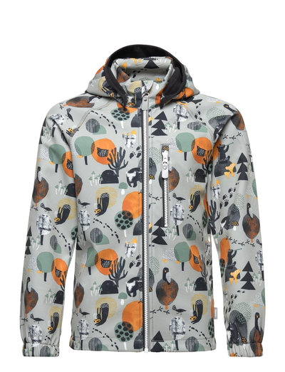 Detale: blocks wind outside, yet breathes | bonded material, fleece on reverse for warmth | safe, detachable kaptur | zip pocket | all-over print | reflective details